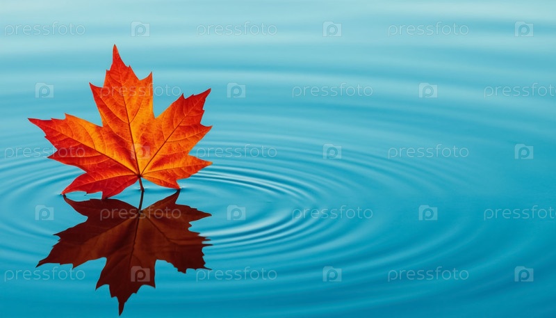 Красный кленовый лист плавает на голубой воде с отражением минималистический осенний контраст. спокойное сочетание тепла, глубины и медитативной тишины