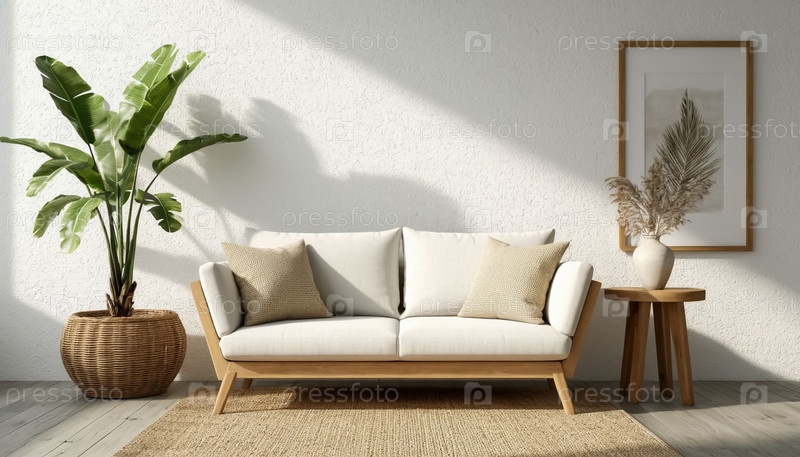 Белый интерьер комнаты: белый деревянный диван против белой стены
