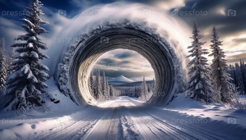 Снежная зимняя ландшафтная дорога с туннелем
