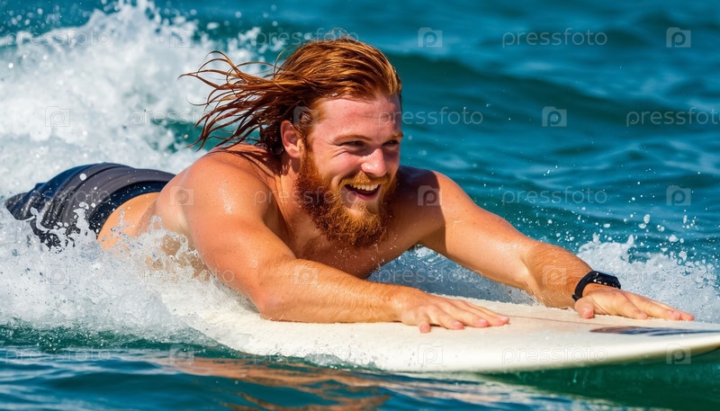 Красивый рыжеволосый мужчина с бородой австралийский в море на доске для серфинга в солнечную погоду