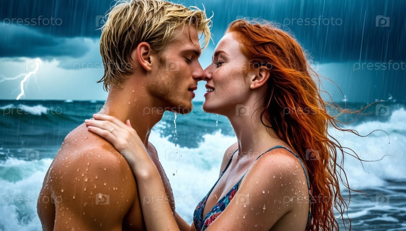 Молодой человек и влюбленная женщина купаются на морских волнах во время грозы и шторма