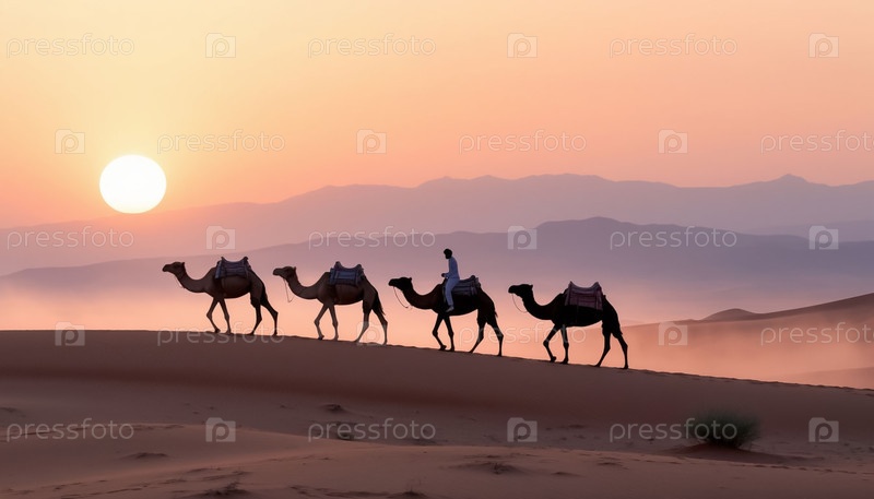 Минималистский ландшафт белой пустыни с верблюдами на закате