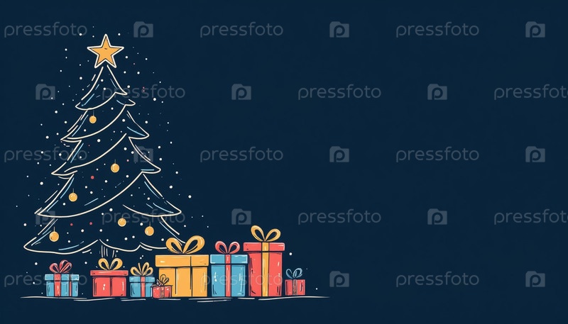 Continuous Line Holiday Banner с деревом и подарками