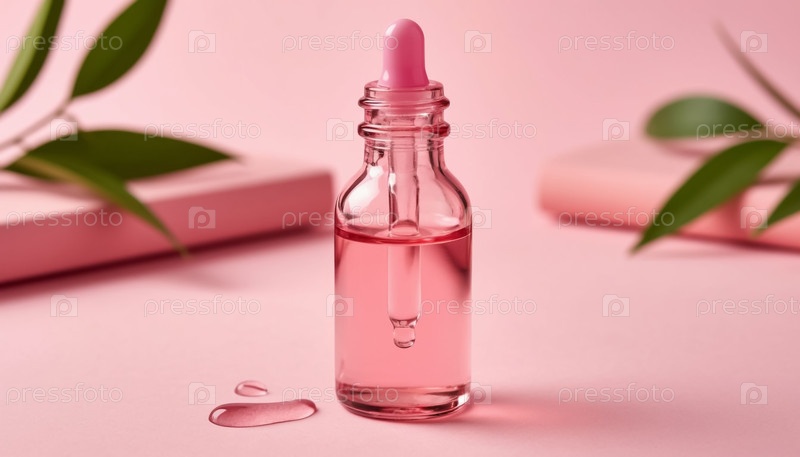 Розовая стеклянная бутылка с маслом для лица с пипетой на пастельном фоне