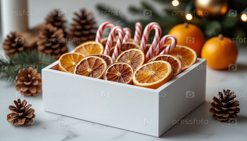 Минималистская белая подарочная коробка сушеные цитрусовые конфеты трость натуральный декор мятный фон