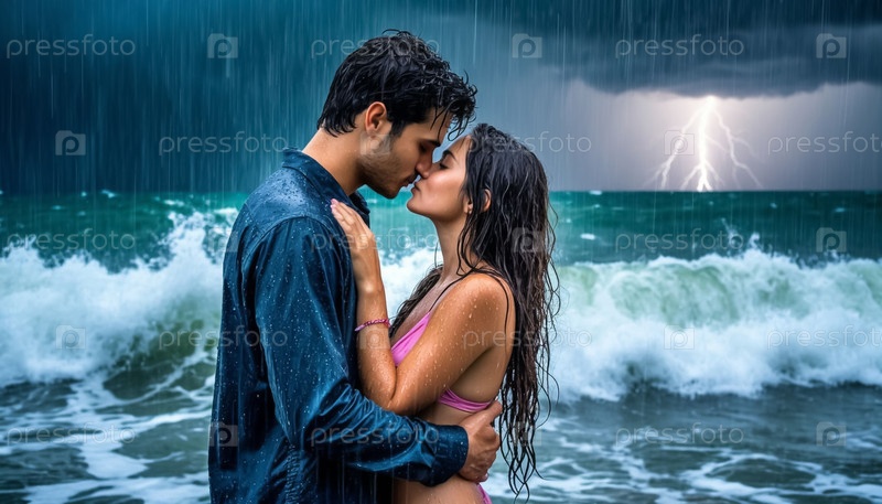 Любящая пара, парень и девушка, латиноамериканцы, страстно обнимаются и целуются на берегу моря во время шторма и грозы