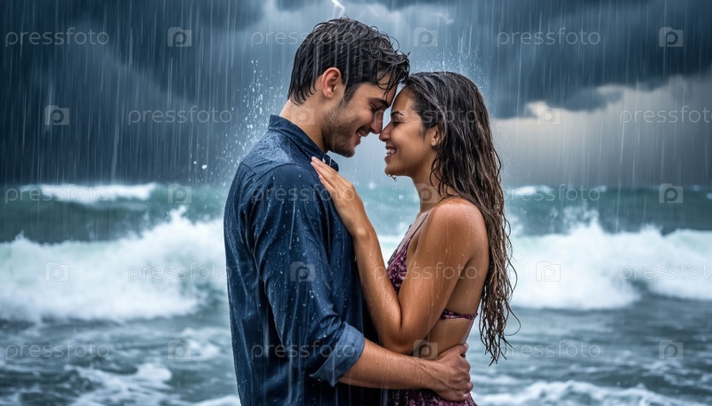 Любящая пара, парень и девушка, латиноамериканцы, страстно обнимаются и целуются на берегу моря во время шторма и грозы