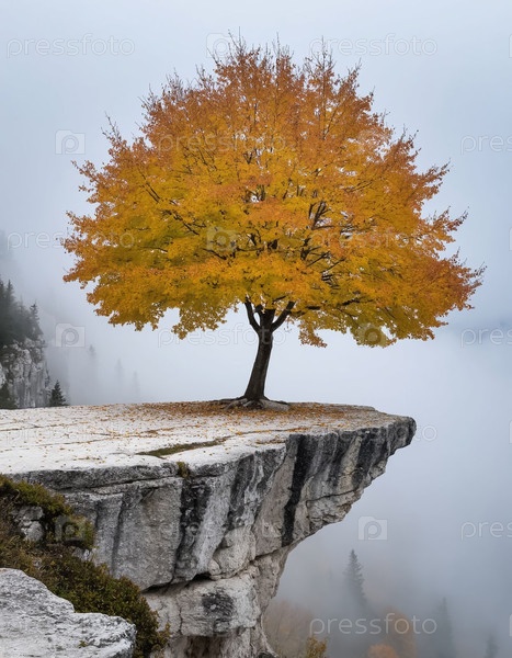 Минималистский осенний ландшафт: одинокое дерево с желтыми листьями на белой скале над туманом. Спокойная, но яркая фотография природы с туманной атмосферой