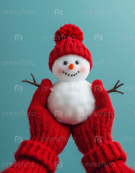 Руки в красных перчатках, держащие мини-снежника на синем фоне