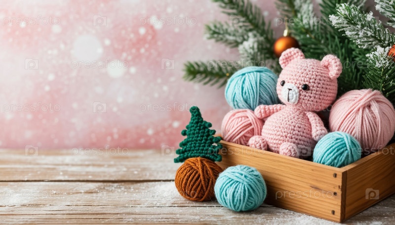 Ручно вязаные рождественские украшения на деревянном столе - уютный ручной праздничный декор с сельским очарованием