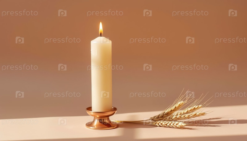 Медный свечник с пшеницей минималистическая композиция copy space