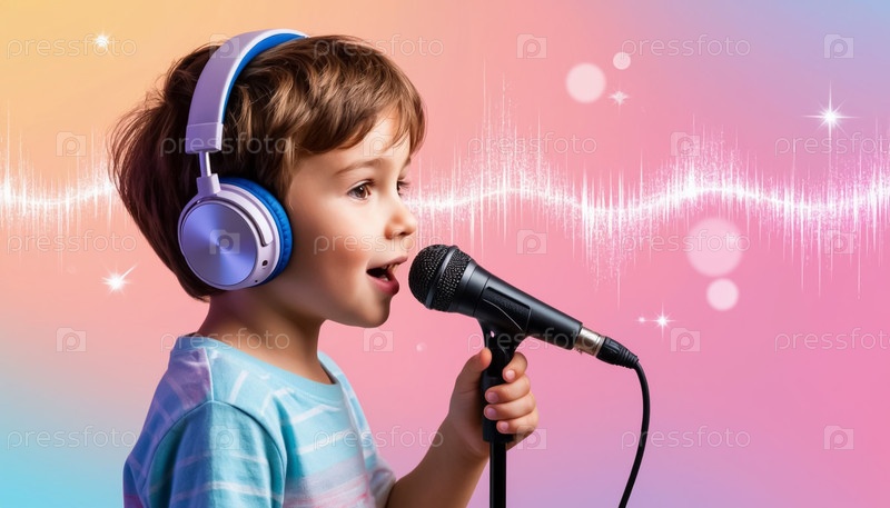 Ребенок-мальчик в наушниках слушает музыку, поющая в микрофон на пастельном фоне с звуковыми волнами