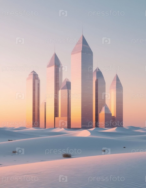Минималистский футуристический город в белой пустыне в пастельных цветах