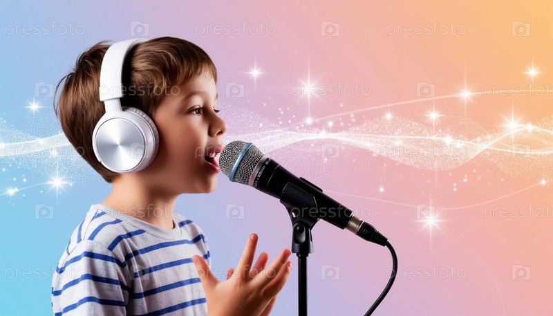 Ребенок-мальчик в наушниках слушает музыку, поющая в микрофон на пастельном фоне с звуковыми волнами