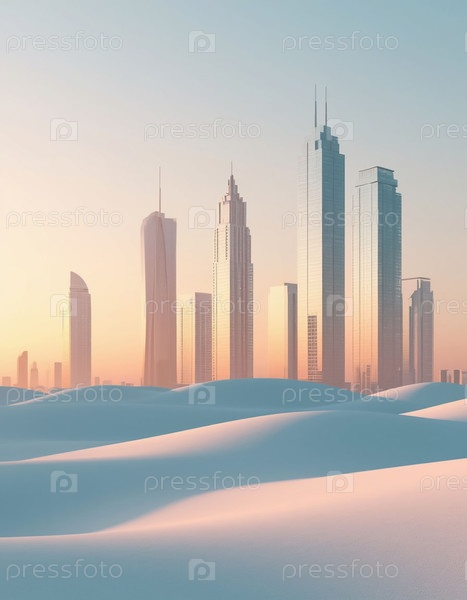 Минималистский футуристический город в белой пустыне в пастельных цветах