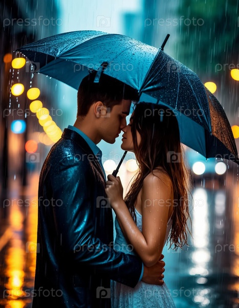 Молодая влюбленная пара, парень и девушка, целуются в городе под зонтиком во время дождя