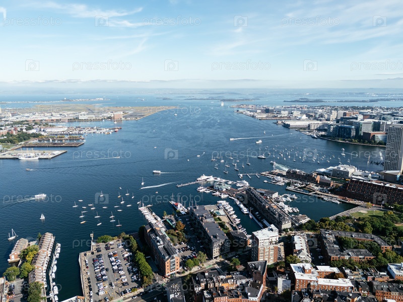 Вид из воздуха Бостонского залива с яхтами.Вид вертолета сверху.Массачусетс, США