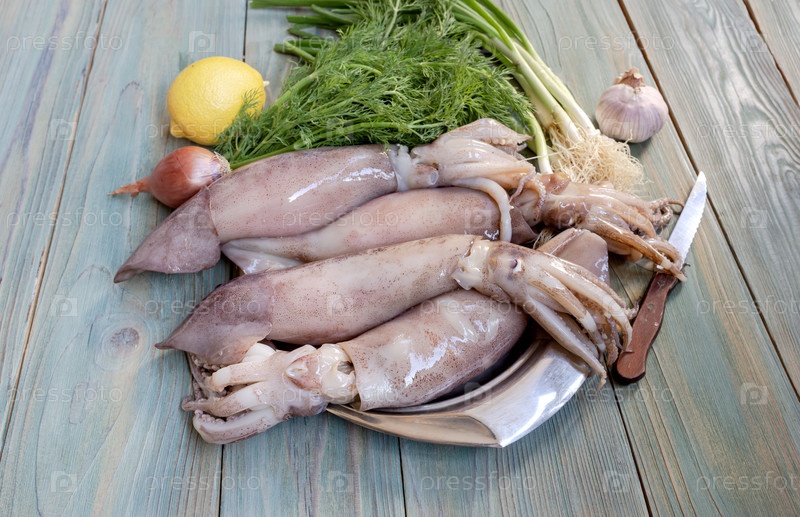 Большие кальмары с овощами на деревянном столе в ближайшем плане