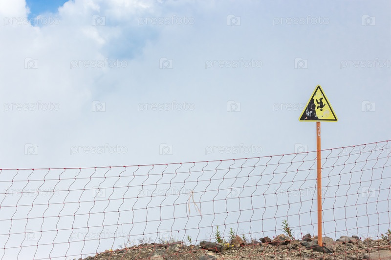 Предупреждающий знак «Осторожно обрыв. Возможность падения с высоты» и ограждение на вершине горы Роза Пик 2320 метров. Красная Поляна, Роза Хутор