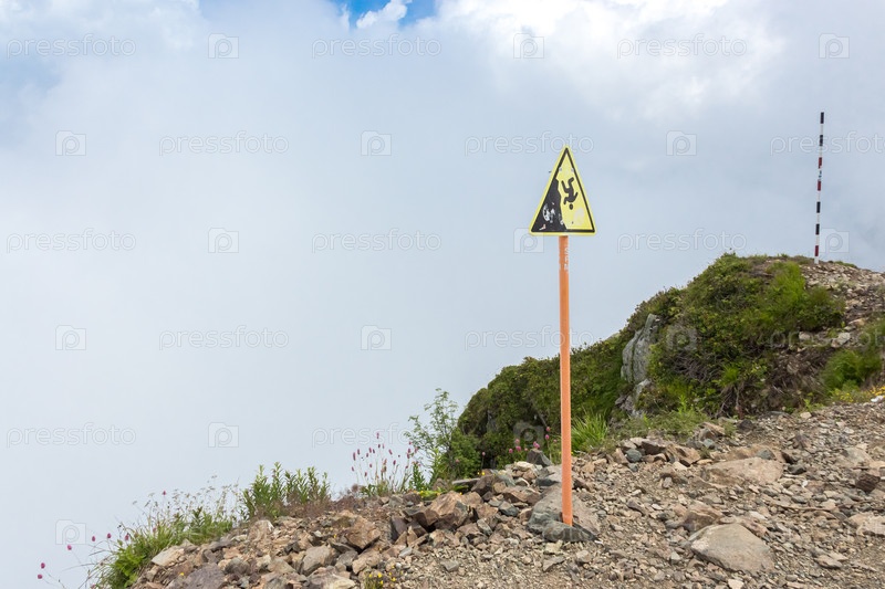Предупреждающий знак «Осторожно обрыв. Возможно падение с высоты» на вершине горы Роза Пик 2320 метров. Сочи, Адлер, Роза Хутор