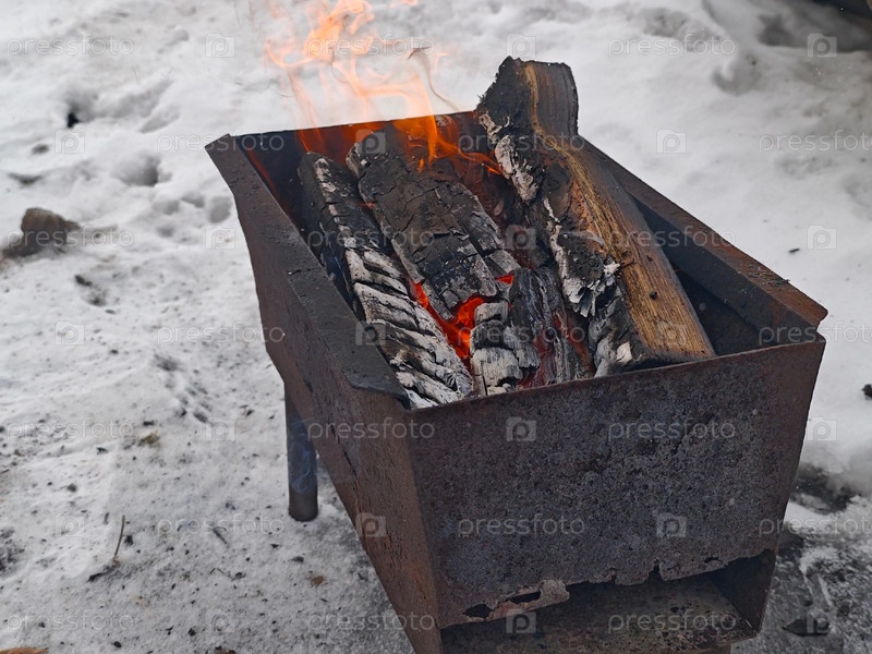 Дрова горят в мангале, дров горит на барбекю