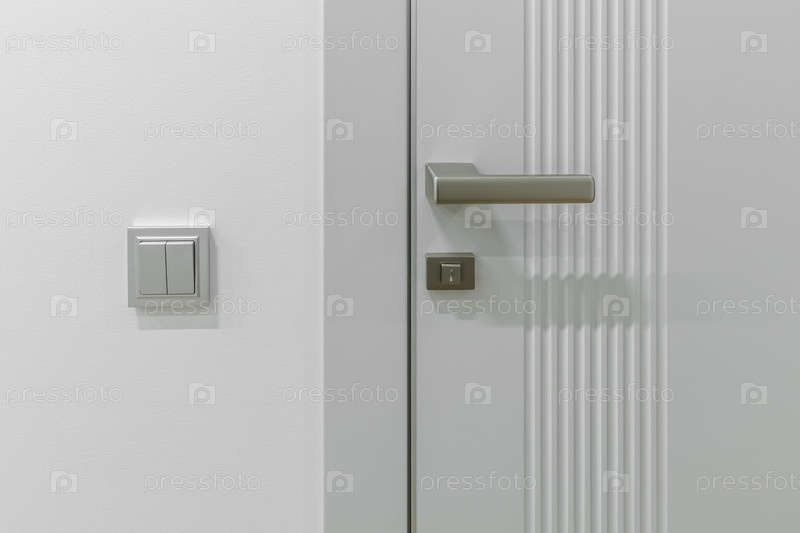 Детали светло-серой внутренней двери с вертикальными линиями, стильной металлической ручкой и соответствующим замком.Минималистский выключатель освещения установлен на прилегающей белой стене