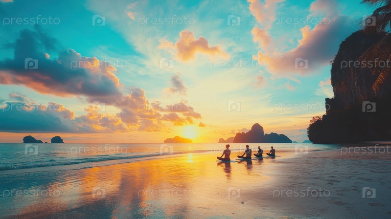 Группа людей, практикующих йогу и медитацию на тропическом пляже во время заката солнца, создает атмосферу гармонии и спокойствия