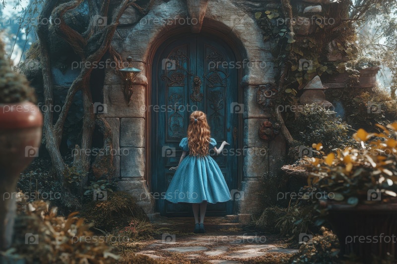 Девушка в синем платье стоит перед древней дверью
