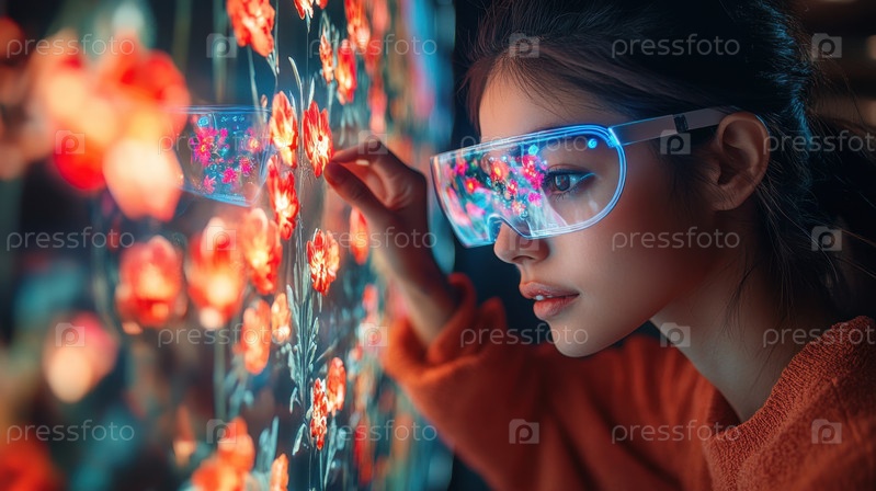 Футуристическая женщина в очках AR, взаимодействующая с цветами