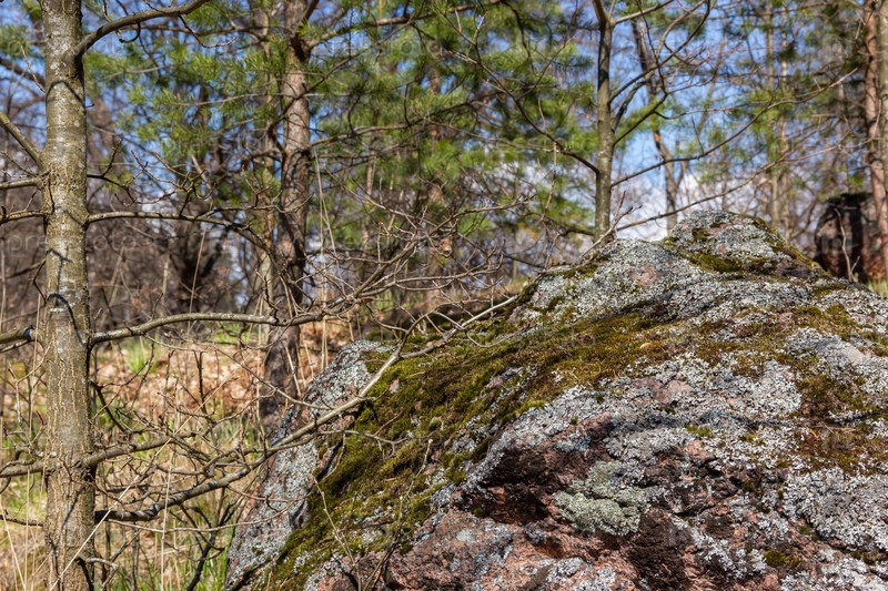 Природа Карелии. Каменная большая глыба, поросшая мхом на лесном склоне среди сосен и других деревьев на фоне голубого неба в солнечный весенний день