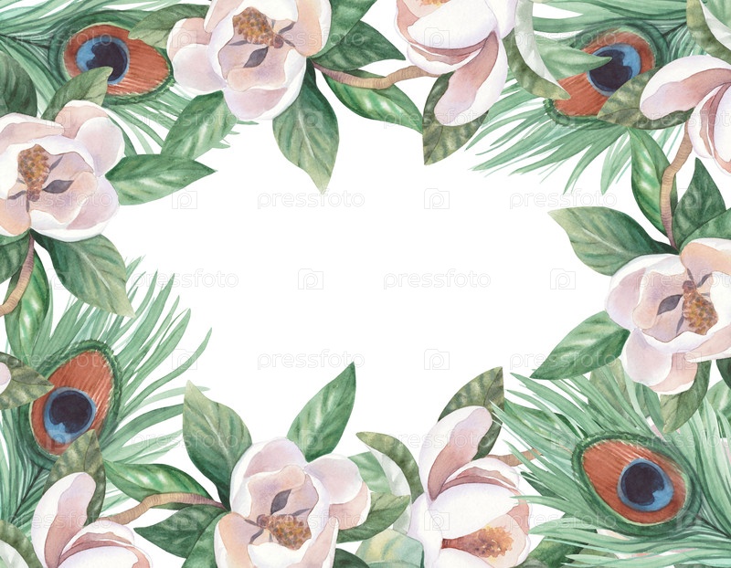 Восстановительная рама из перьев павлина и магнолии.Ручная акварельная иллюстрация.Для карточек, обложки, обоев, принтов, этикеток на продуктах и ткани