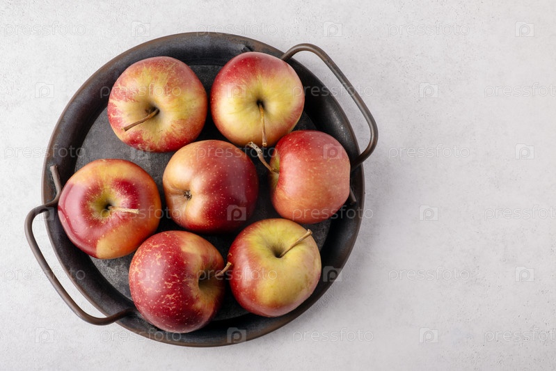 Свежие красные яблоки в деревенской металлической подносе
