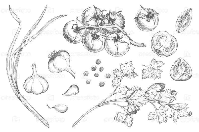 Набор овощных фигур в графике. чернил ручной рисунки предметов из чеснока, помидоров, зеленого лука, черного перца и петрушки. векторные элементы