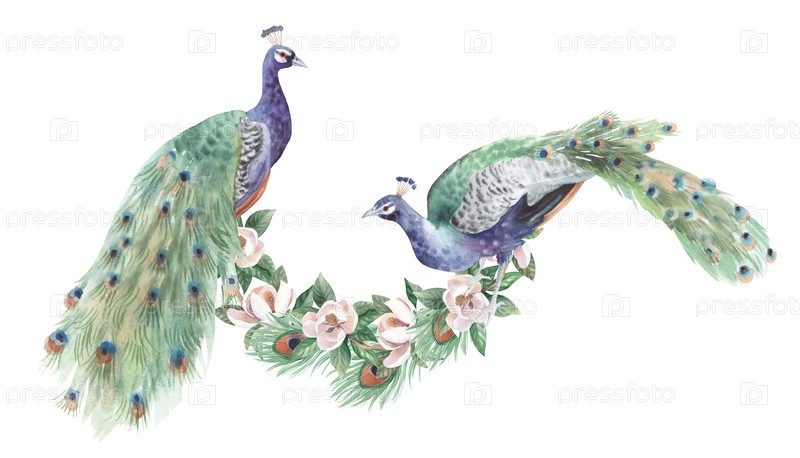 Состав паунов, цветущие магнолии и перья. Илюстрация с акварелью ручной работы. Для карточек, обложки, обоев, принтов, этикеток на продуктах и ткани
