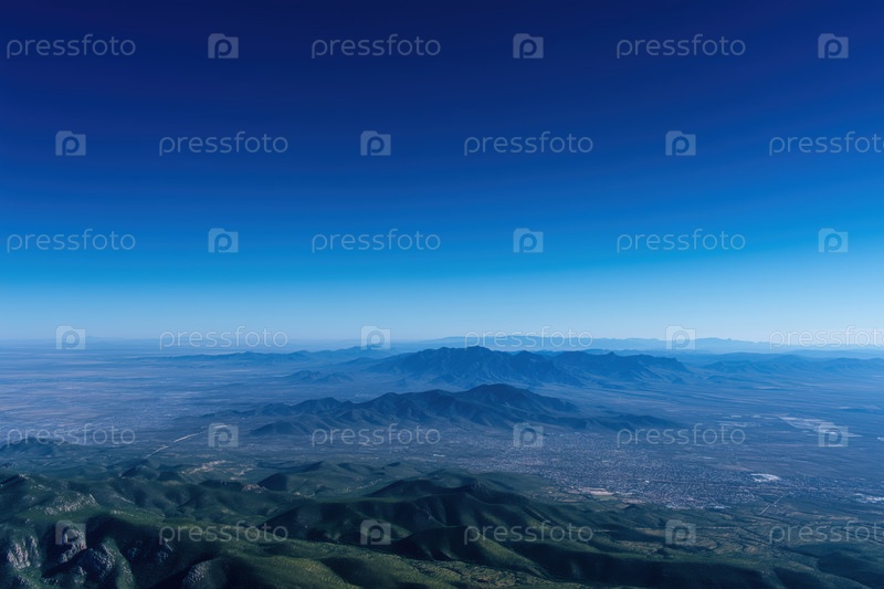Вид с воздуха на горную местность и долину с голубым небом