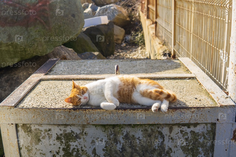 Имбирный кот дремлет на бетонном блоке снаружи