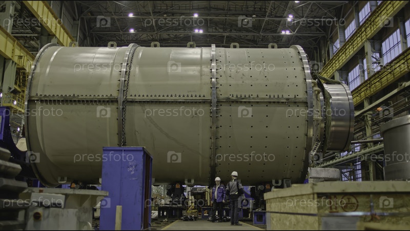 Работники на заводе с танками. Скотч-клип. Рабочие в жестких шляпах с огромными резервуарами на фабрике. Трудящиеся в промышленной мастерской ходят вокруг машин и танков