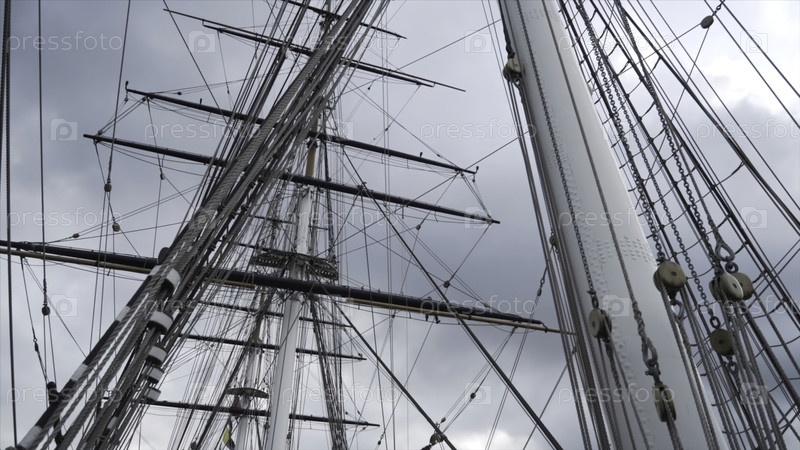 Ближайшее изображение буксировки и мачты судна Cutty Sark на голубом облачном небе
