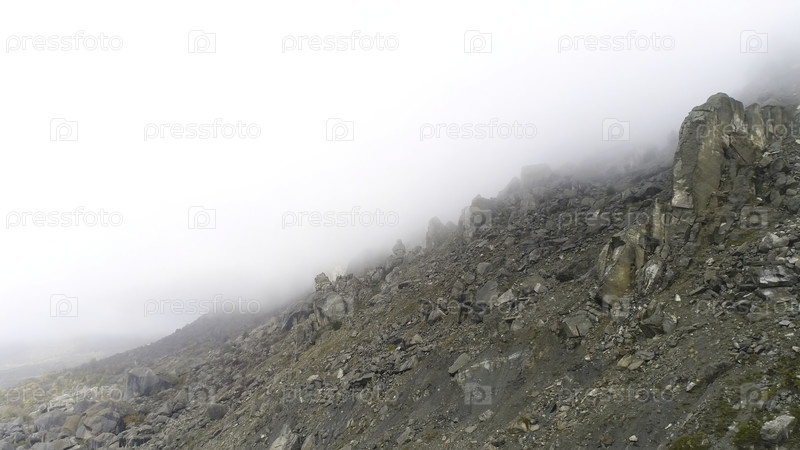 Величественные горы в густых облаках, пейзаж с красивыми скалами и драматическим туманом на фоне природы