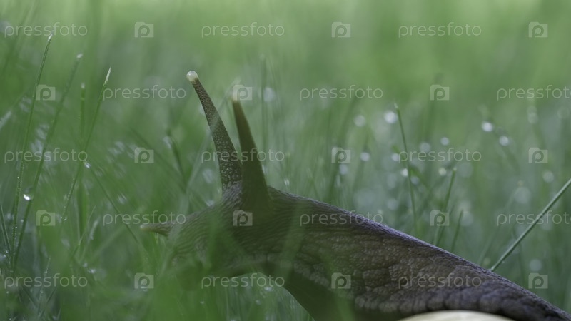 Улитка, сидящая на зеленой летней траве.Креативно.Насекомое с длинными густыми усами сидит в траве, на которой есть маленькие капли дождя