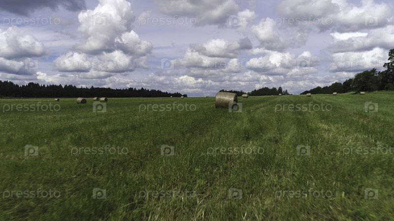 Сельское хозяйство, сенообразовательная концепция, большое зеленое поле на фоне синего облачного неба. Снимок. Балы сена с сухой травой. со зеленым лесом, растущим далеко в отдалении