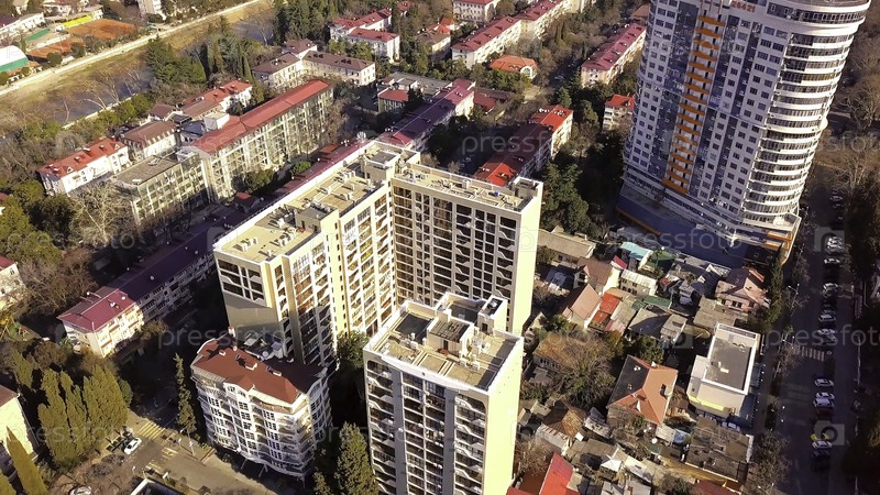 Современные городские дома с красными крышами в лучах солнца. Клип. Вид сверху на многоэтажные жилые здания, освещенные заходящим солнцем