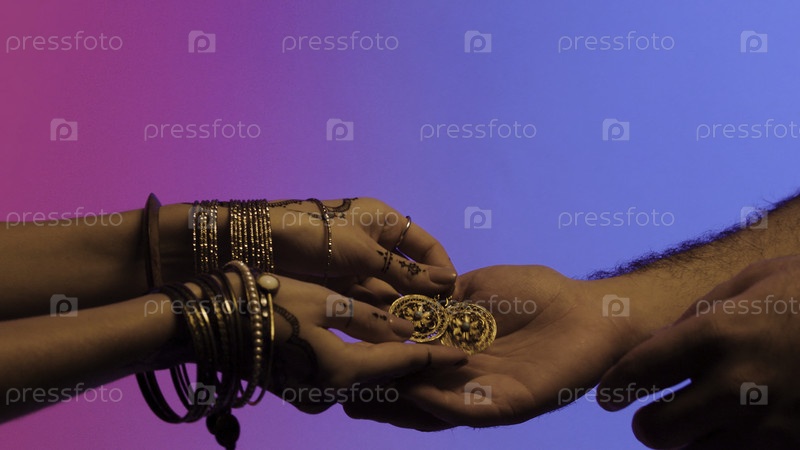 Женские руки мехенди дают золотые, восточные винтажные ручные серьги на красочном фоне, концепция продажи античных ювелирных изделий