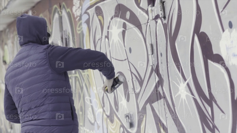 Мужчина-художник рисует и распыляет краску на стену, концепция уличного искусства. Действие. Боковой вид рук мужчины во время процесса создания граффити на бетонной стене