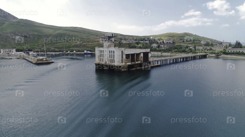 Заброшенная прибрежная деревня.Снято.Вид сверху заброшенной рыбацкой деревни на побережье голубого моря.Забытая фабрика на побережье синей лагуны в Крыму