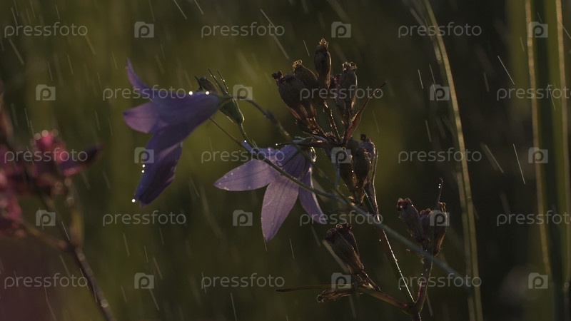 Летняя луговая трава и травки.Креативность.Теплый дождь падает на красивые фиолетовые и розовые цветы, растущие в поле