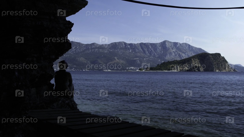 Вид на море.Креативный.Вид одного маленького мальчика, который сидит и наслаждается видом на море, а за ним зеленые горы и синее чистое небо