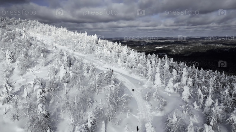 Уставшие мужчины ходят в одиночку по снежному лесу.Клип.Аэрофотосъемка туристов, потерявшихся зимой в заснеженном лесу