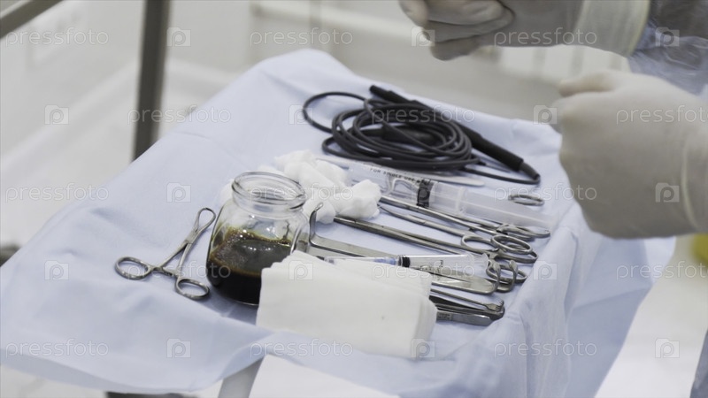 Ближайшее изображение стерильных хирургических инструментов для лапароскопической операции.Инструменты для медицинской хирургии со стеклянной чашей йода, концепция здоровья и медицины