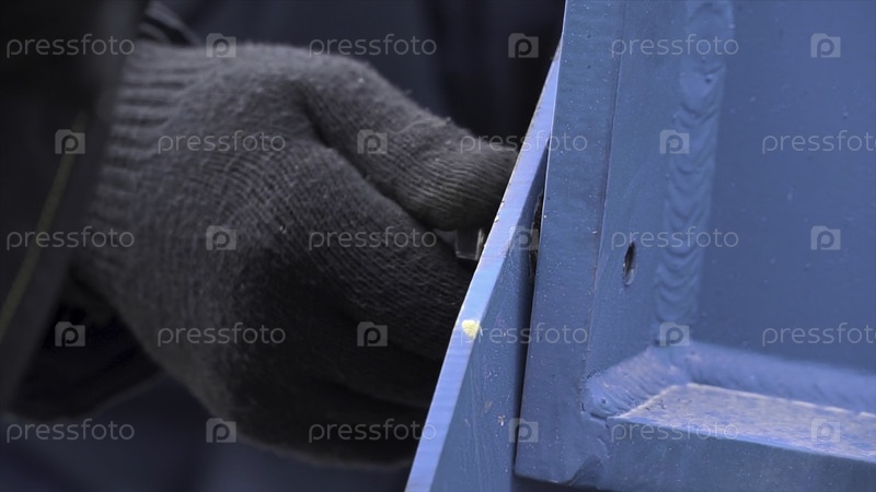 Закрыть для человека руки в защитных перчатках развязать болт с помощью английского ключа на металло-синей структуре. клип. демонтаж металлической конструкции